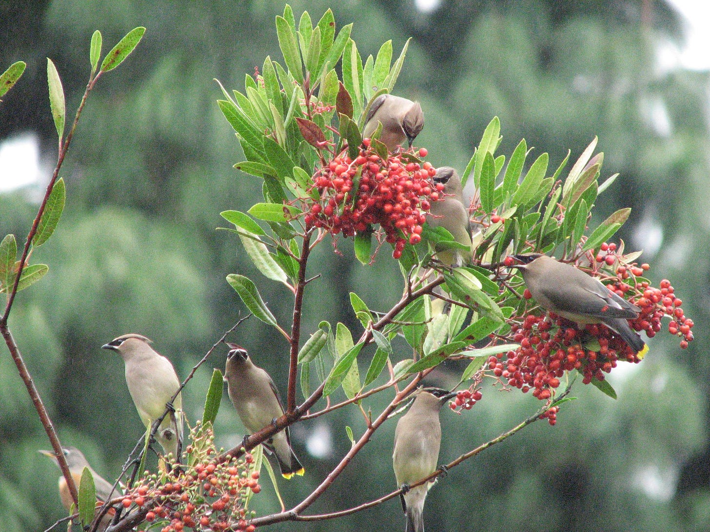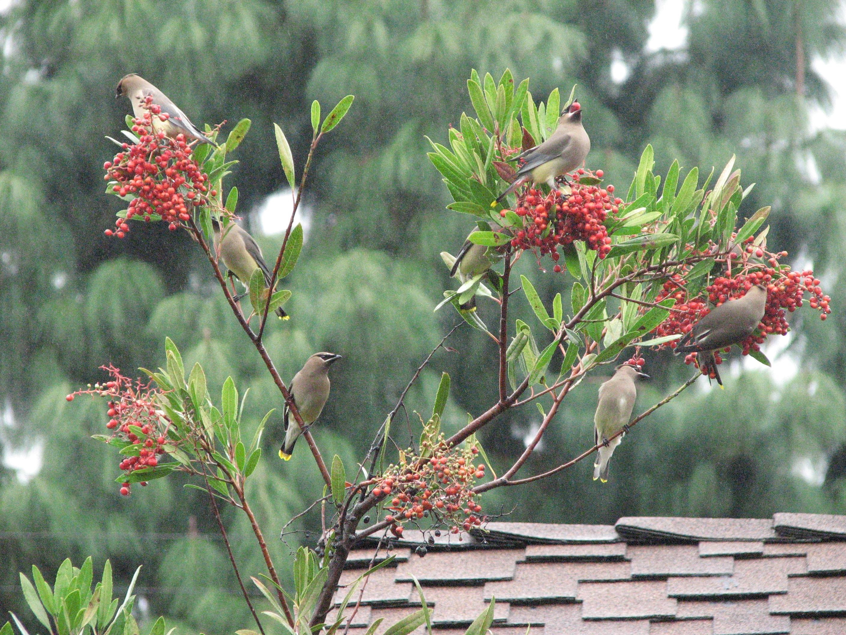Normally upright, the fifteen-foot-tall toyons sagged and dripped with birds, branches bobbing. An ebullient feast ensued, the waxwings and robins gulping down berries and chattering, unmistakably happy. When I’d planted the toyons seven years earlier, I never dreamed I’d see a scene like this.