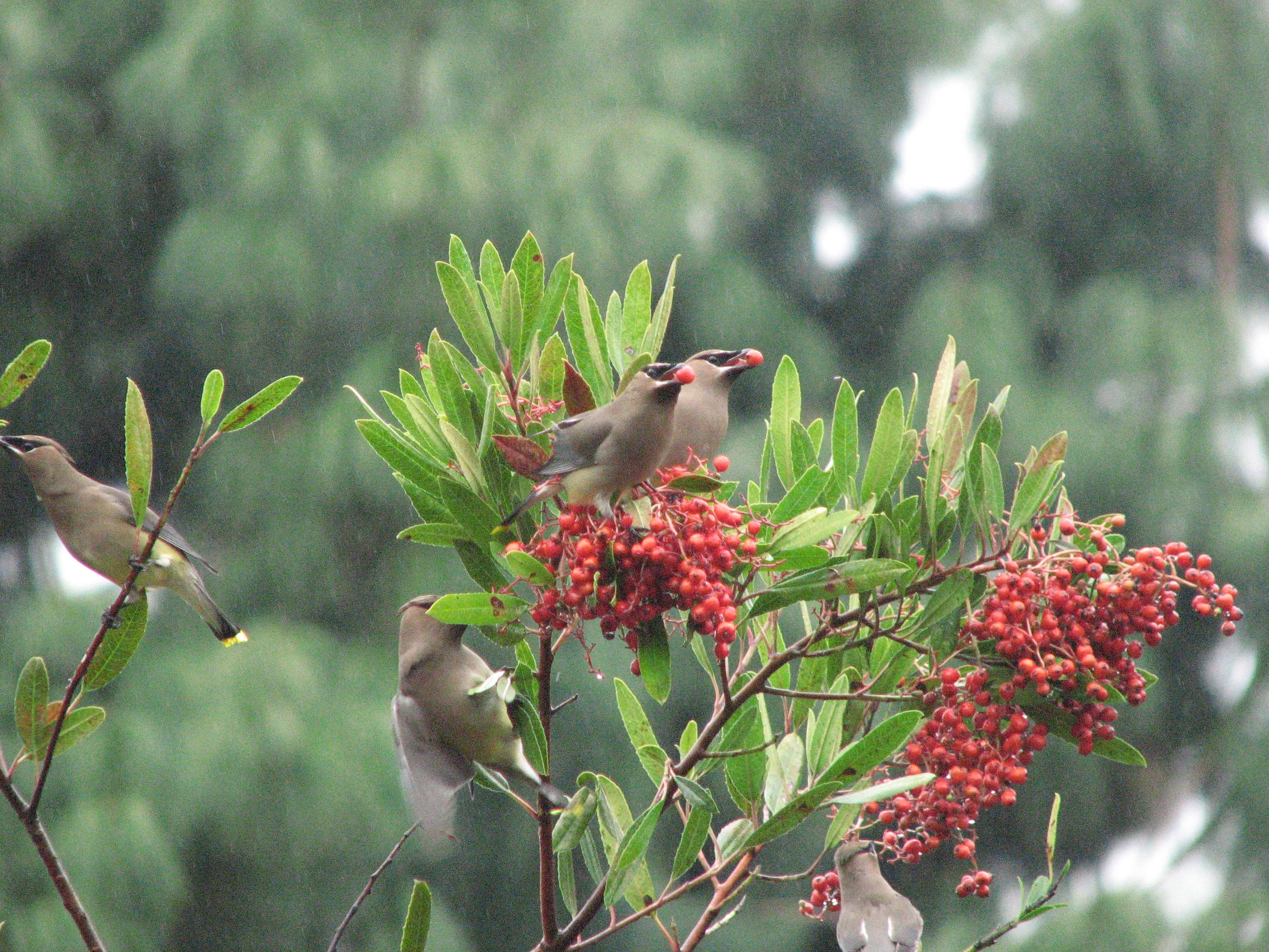 For the next few hours, Antonia and I watched the waxwings and robins fly in cyclic waves between the elderberry and the toyons. Even the way the groups changed places seemed choreographed by the same spirit of consideration: The group flying to the elderberry would arc high over the tree and drop down onto the canopy, while the group flying to the toyons would swoop low and rise to the berries, the groups thereby avoiding awkward mid-air encounters. And as the birds cycled through the toyons, eating away, the bushes looked progressively less red and more and more green.
