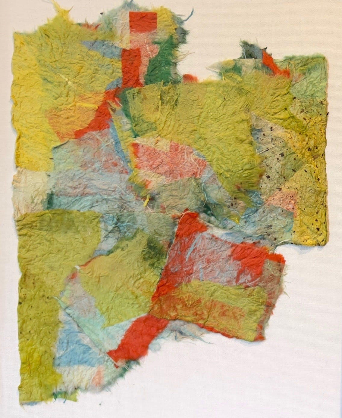 The two blue, orange, and chartreuse ones were inspired by water and its calming effects: I'm making various pieces to represent various bodies of water that I've experienced. A Bright Day By The River, and the other is Napa River with Poppies. Both of these pieces were created using the ancient 500 year old Korean technique of paper felting called Joomchi. Joomchi is layers of individual hanji papers bound together by water and aggressively manipulated with your hands until the fibers break down and all of the layers fuse into one creating a fabric-strength piece of paper. Joomchi was used to make clothing due to its cloth-like texture and strength.