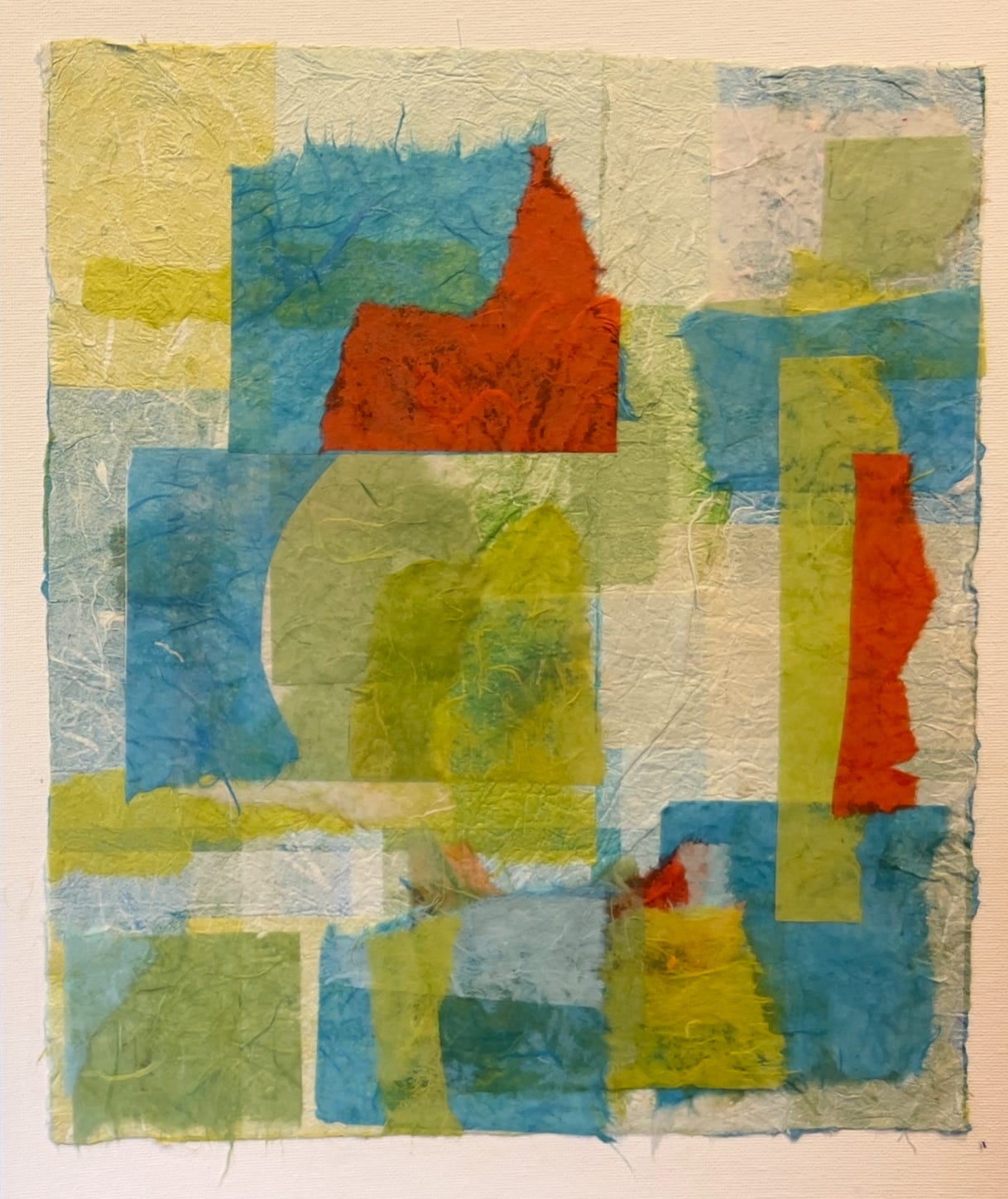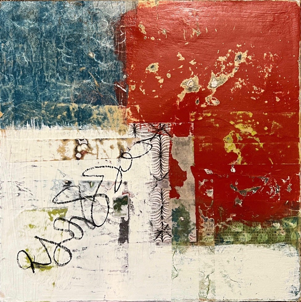 Jennifer Lynne Roberts: The red, white, and teal one is untitled: Untitled is mixed media collage using painted papers, chalk, pastels, house paint, newsprint and other found papers. I was inspired by the way the bright red played against the blue-green with the glimpses of under layers of chartreuse and green. For me, it was a study in color and texture and decay. I wanted something to resemble years of exposure to the elements of nature.