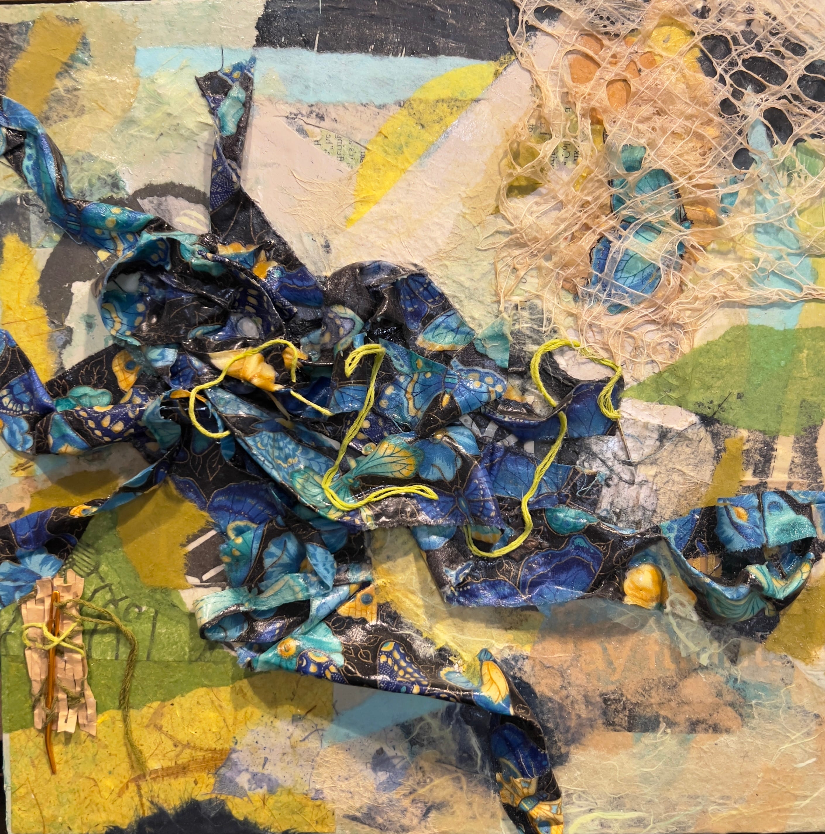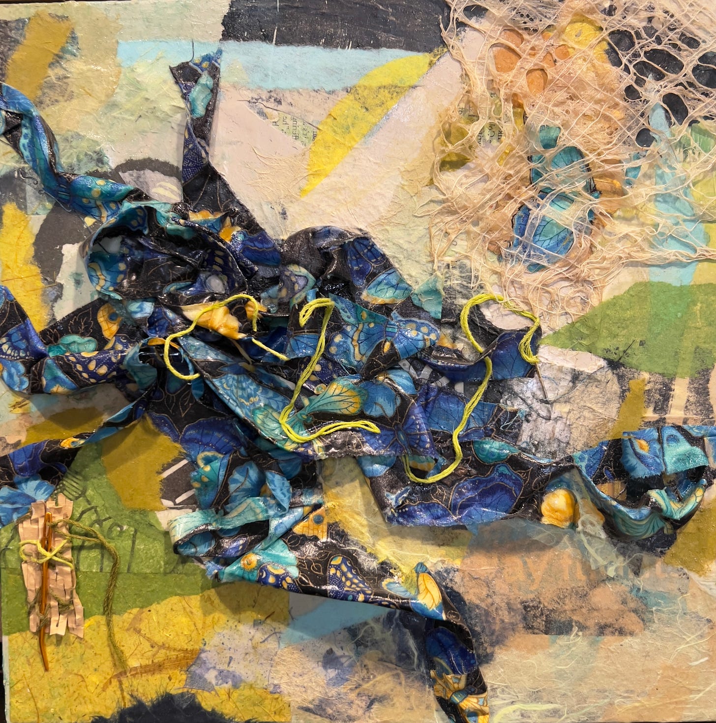 Pattern Making is a 3D collage using some of my grandmother's thread and vintage fabric. Inspiration for Pattern Making came about when I inherited a box of my grandmother's vintage fabrics from the sixties and early seventies. I don't sew, but I wanted to honor her in a way that showed respect for her pattern making and the clothes she used to make for us. Pattern Making is mixed media using fabric, paint, and found papers.