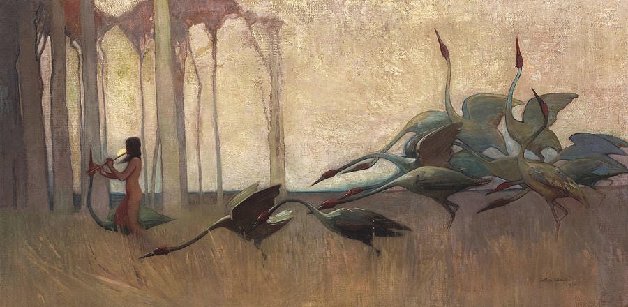 Spirit of the Plains (after the painting by Sydney Long in the Queensland Art Gallery) She strolls across the naked field, her skin the cast of ghostly gums that stand beyond in pink revealed her face eclipses, the moon succumbs. The brolgas trail, with flute she leads the birds with upturned open beaks matching the forks of nouveau trees, through a ballet prance with upward leaps. Harbinger of Federation drought, the grasses dry and brown and frayed, the cranes ecstatic in their mount their motion unbroken, a cresting wave. This land will suffer an endless bake the brolgas dance, all else is fate.