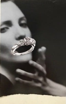 This poem/visual art piece is part of a decades-long collaborative project pairing my poems with collage art by Marie Carbone, which I have Marie's permission to use. Created in intentional or accidental relationship to each other, the poems and collages are not equivalences or illustrations of their partnered art; they are extensions of a conversation, a palimpsest in which we each often speak over each other or at cross-purposes to make new meanings.